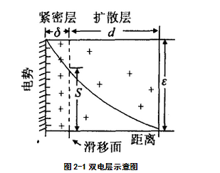 緊密層與擴散層間交界處稱為滑移面(或Stern面)。顯然緊密層與介質內部之間存在電勢差,稱為ζ電勢。此電勢只有處于電場中才顯示出來。在電場中膠粒會向異號電極移動,稱為電泳。在特定的電場中,ζ電勢的大小決定于膠粒的運動速度,故ζ電勢又稱電動電勢。